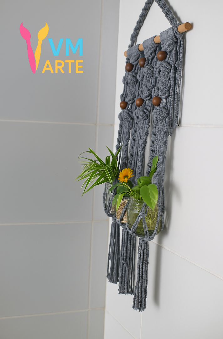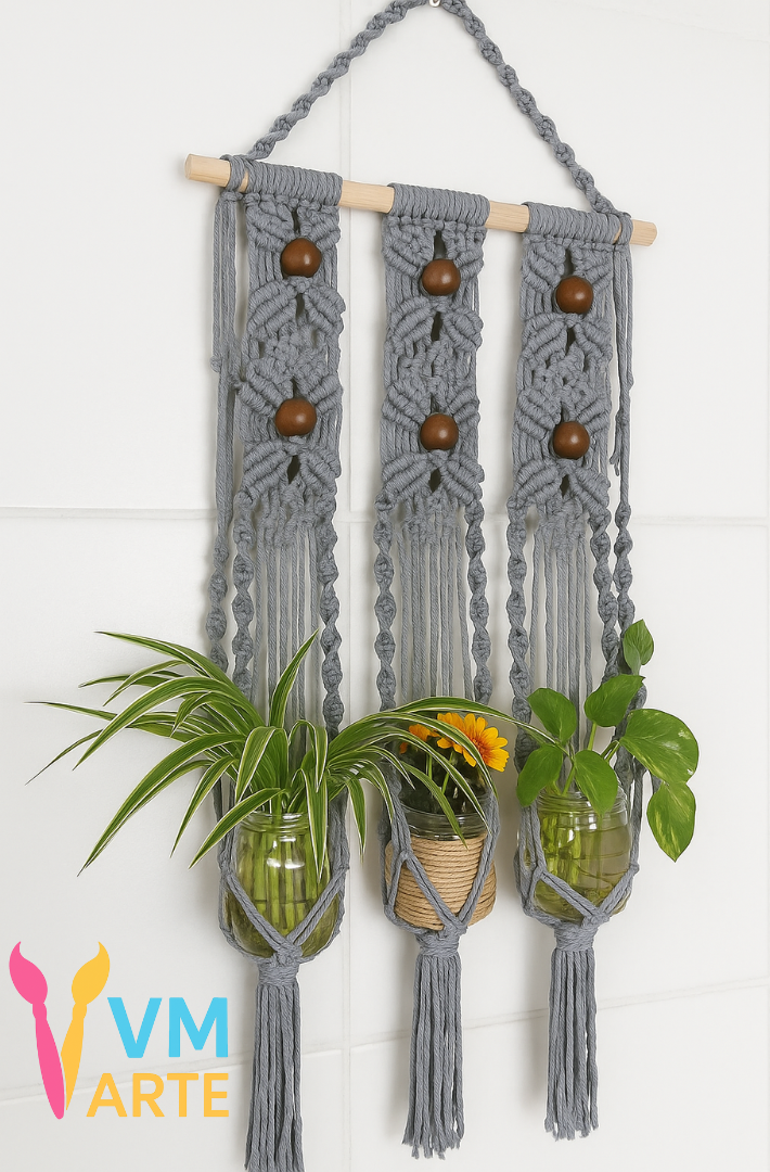 Painel em Macramê, com base em madeira, esferas de madeira, espaço para três pequenos jarros de plantas.
